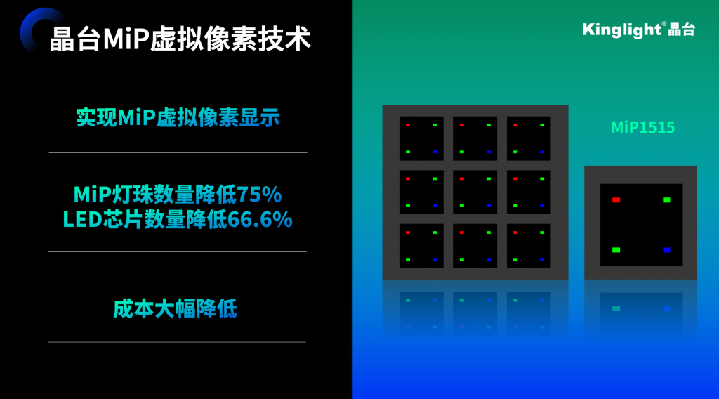 kinglight晶臺的MiP封裝技術具有七大優勢,包括:顯示均勻性好,兼容性高,高可靠性高防護性,墨色一致性好,超高對比度,超大顯示角度。同時加持kinglight晶臺的MiP虛擬像素技術,可將MiP燈珠數量降低75%,LED芯片數量降低66.6%,幫助企業大幅降低生產成本。