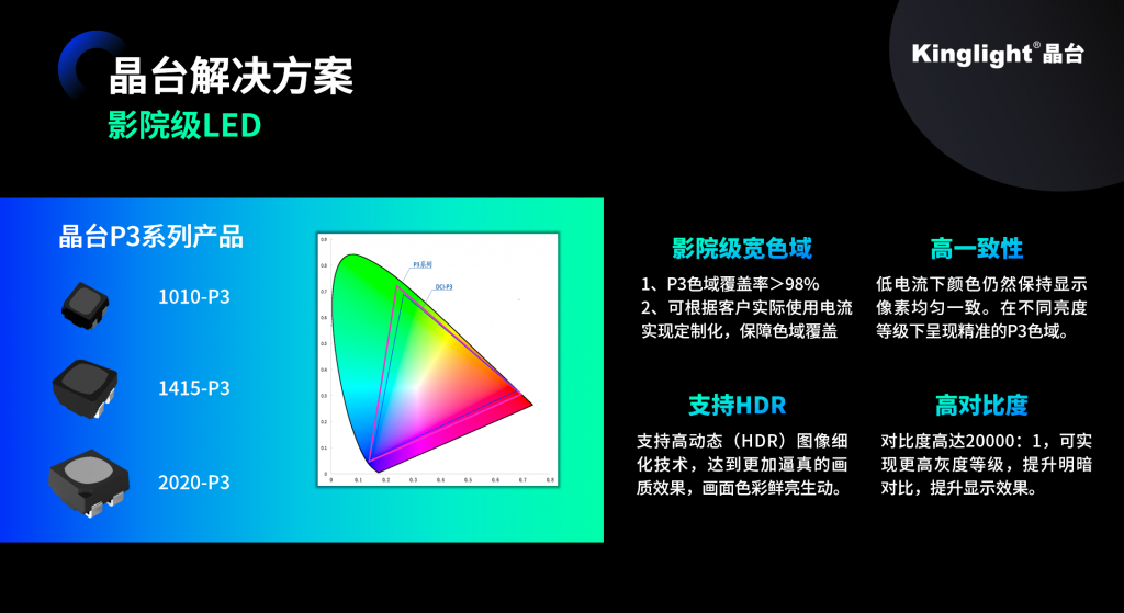 針對專業顯示廣電制播領域中影院顯示與虛擬影棚XR/VP兩個細分市場。其中,面向LED影院推出的P3系列顯示燈珠具備影院級寬色域、高一致性、高對比度、支持HDR四大優勢,真正讓影院顯示屏實現細膩逼真、色彩鮮亮的顯示效果。