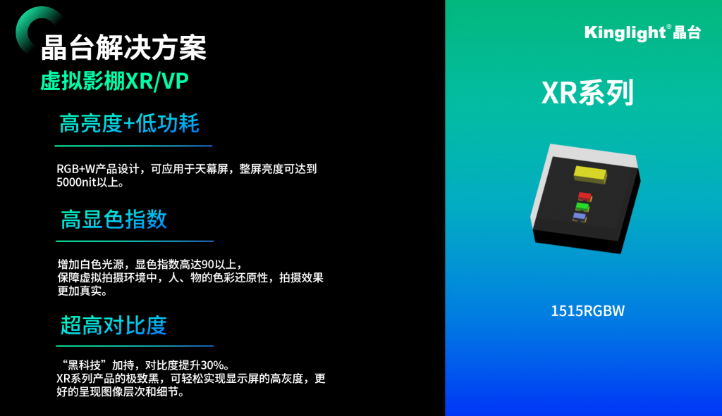面向虛擬影棚XR/VP應用,kinglight晶臺在原有1212、1415兩款XR系列顯示燈珠的基礎上,全新推出1515 RGBW 產品,與傳統XR顯示燈珠相比,其增加了白色光源,顯色指數高達90以上,保障虛擬拍攝環境中,人、物的色彩還原性,拍攝效果更加真實。