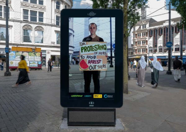 在英國(guó)的大城市街頭,一場(chǎng)看似靜默卻令人震撼的抗議正在進(jìn)行。綠色和平(Greenpeace)聯(lián)合多個(gè)人權(quán)與環(huán)保組織,在倫敦、曼徹斯特和伯明翰三地的DOOH廣告屏上同步上線了一場(chǎng)別開生面的數(shù)字抗議活動(dòng),名為:“他們無法逮捕這個(gè)廣告牌”(They Can’t Arrest This Billboard)。